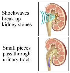 Lithotripsy is a method of breaking the stone while it is still inside the body. It is a non invasive procedure that does not require any cut or hole in the body. During lithotripsy electromagnetic shocks waves are passed harmlessly through the body targeting only the stone, causing it to break up into sand like particles. These small particles are then passed out of the body along with the urine.